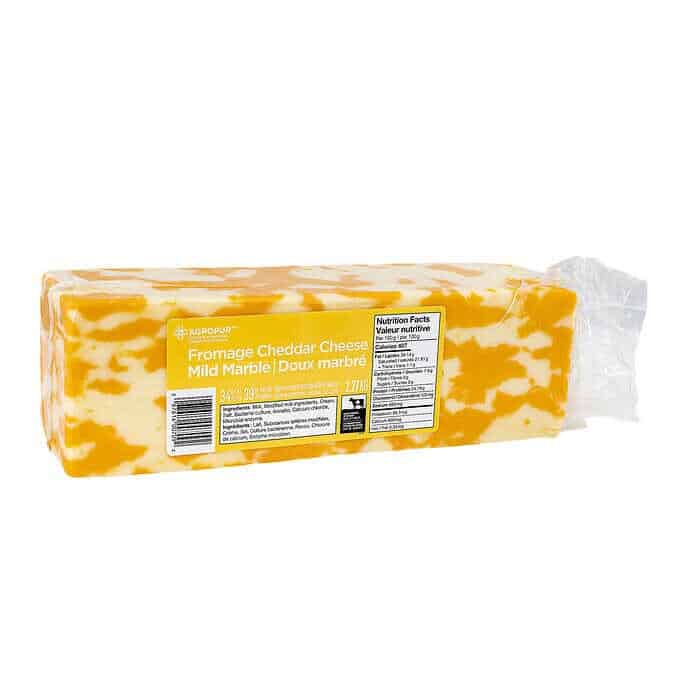 Agropur Mild Marble Cheddar Cheese is the perfect addition to any meal. Made with Canadian milk, our cheese is 34% M.F. and has 39% moisture. With 2.27 kg of cheese, you'll have plenty to go around. Plus, be sure to keep it refrigerated for the best taste. Enjoy the delicious taste of Agropur Mild Marble Cheddar Cheese today!
