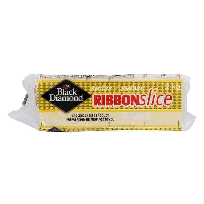 Black Diamond Swiss Style Ribbon Slice is a processed cheddar cheese product with easy peeling staggered slices, 96 sandwich slices and 128 burgers slices in a 2 kg container. Keep refrigerated.