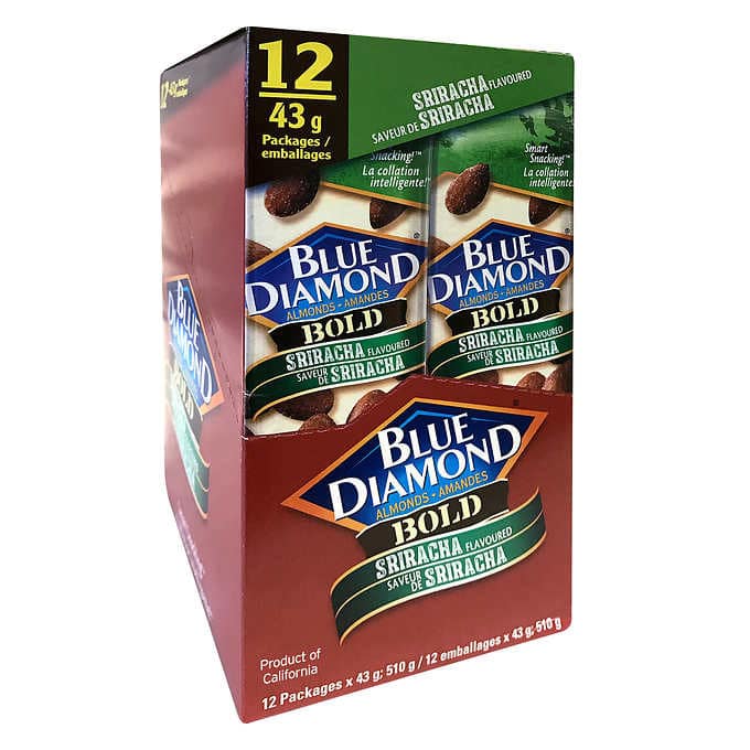 Blue Diamond Sriracha Almonds are a great snack for any occasion! With a spicy Sriracha flavour, these almonds come in individual foil pouches of 12 × 43 g (1.5 oz). Enjoy a tasty treat with Blue Diamond Sriracha Almonds!