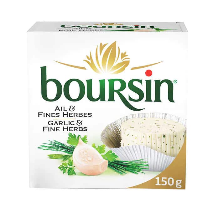 Boursin Garlic and Fine Herbs Cheese is a fresh soft white cheese with 39% M.F. and 50% moisture. It is conveniently packaged into 2 containers of 150g each and should be kept refrigerated. It has the perfect combination of garlic and fine herbs, making it the ideal choice for any occasion.