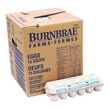 Burnbrae Farms Large White Eggs in Cartons provide 6g of protein per serving and are Grade A quality. They come in 15 one-dozen cartons, are gluten-free and lactose-free, and should be kept refrigerated.