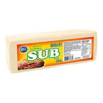 Chef Nutri White-cheddar-style Sub Slices are 80 slices of 4.32 cm × 26.67 cm (1.7 in × 10.5 in) slices of 60% analogue and 40% cheddar cheese with 0 trans fat and 15% source of calcium. Comes in a 2 kg container and must be kept refrigerated.