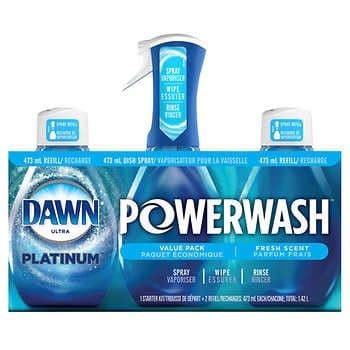 Dawn Platinum Powerwash Dish Spray with Refills is a dishwashing solution that comes in a continuous spray form and provides a fresh scent. The package contains 3 containers of 473 mL each.