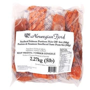 Experience the delicious taste of Norwegian Fjord Frozen Steelhead Salmon! Our steelhead salmon is individually quick frozen and vacuum packed for the freshest taste. Each portion is boneless, skinless, and free from chemicals, antibiotics, or GMOs. With 170 g (6 oz) portions and a 2.27 kg (5 lb) box, our steelhead salmon is the perfect addition to any dinner. Keep frozen for the best flavor and quality. Try Norwegian Fjord Frozen Steelhead Salmon today!