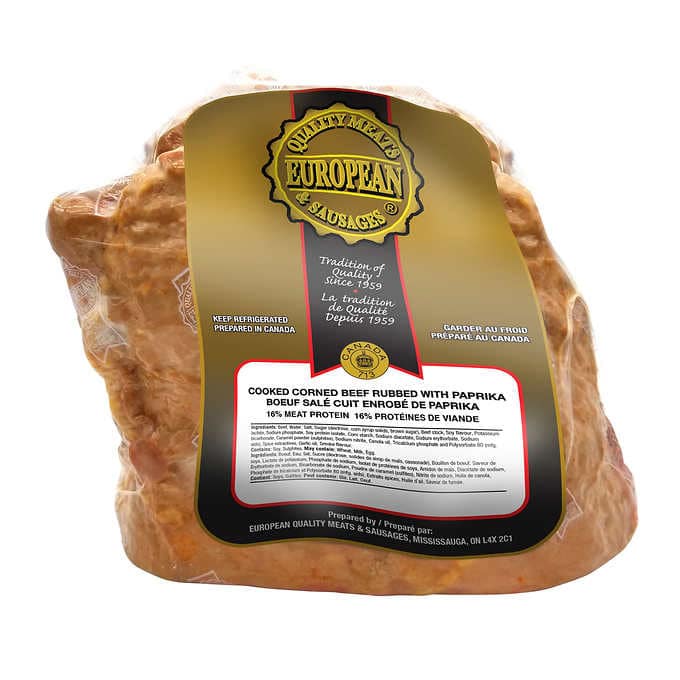 European Quality Meats- Cooked Corned Beef is a deli/deli meat with 16% meat protein, rubbed with paprika and must be kept refrigerated. The average weight of the product is 3.5kg.