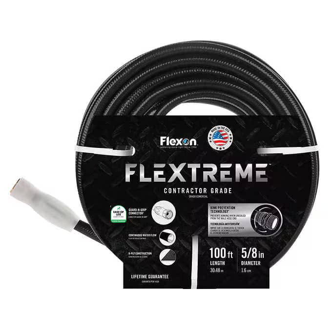 Introducing the Flexon 5/8 in. x 100 ft. Contractor Grade Hose with Guard & Grip - the perfect hose for any contractor. Our hose is built to withstand the toughest jobs and is designed with your comfort in mind. The Guard & Grip feature prevents kinks and tangles, making it easy to maneuver around any job site. With its durable construction and flexible design, this hose will quickly become your go-to for any project.