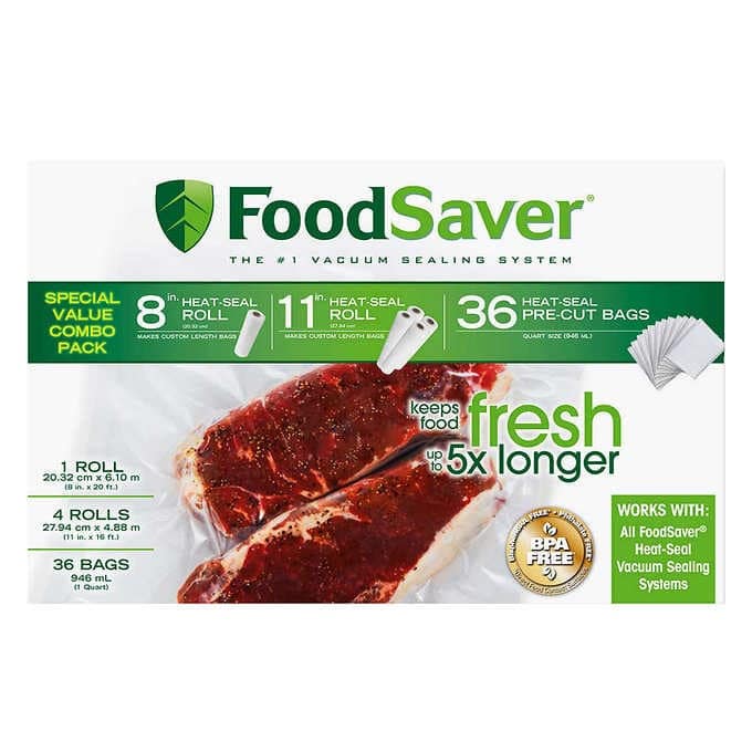 The Foodsaver Roll and Bag Combo Pack is the perfect solution for all your heat-sealing needs. BPA-free and strong enough for freezing, microwaving, and simmering, this combo pack is compatible with all Foodsaver heat-seal vacuum sealing systems. It includes 1 × 20.32 cm × 6.10 m (8 in × 20 ft) heat-seal roll, 4 × 27.94 cm × 4.88 m (11 in × 16 ft) heat-seal rolls, and 36 × 946 mL (1 qt) heat-seal pre-cut bags. With its clear design, this combo pack measures 30.48 cm (12 in) in length and 13.97 cm (5.5 in) in width, making it the ideal choice for all your food storage needs.