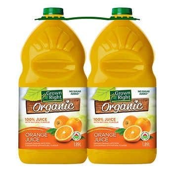 Indulge in the delicious taste of Grown Right Organic Orange Juice! This 100% juice is made with natural oranges and contains no added sugar. Each package comes with two 1.89 L containers, so you can stock up and never run out. Enjoy a healthy and refreshing beverage with Grown Right Organic Orange Juice!