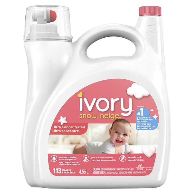 Ivory Snow Liquid Laundry Detergent is specially formulated for Newborn Babies and is Hypoallergenic. It is formulated for both high efficiency (HE) and Standard Washers and can handle up to 113 wash loads (4.55 L). Made in the USA, this detergent is the perfect choice for your laundry needs.