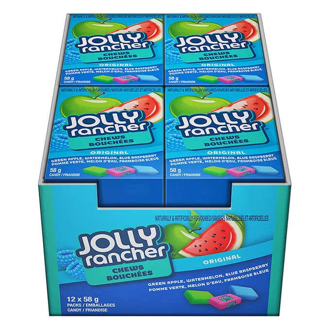 Indulge in the sweet taste of Jolly Rancher Chews! These delicious chews come in a variety of assorted fruit flavors and are perfect for sharing. Each package includes 12 containers of 58 g for a total of 696 g of candy. With a NEW improved flavor, these chews are sure to be a hit with the whole family! Enjoy the unique flavor of Jolly Rancher Chews today!