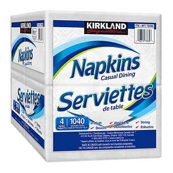Kirkland Signature Napkins are 1-ply with a white color, dimensions of 28.9 cm x 30.4 cm, and come in 4 packs of 260 for a total of 1,040 napkins.
