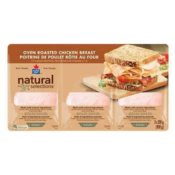 Maple Leaf Natural Selections Sliced Chicken is a gluten-free and nitrite-free deli meat made from 21% meat protein. It comes in a 900 g package and should be kept refrigerated. It has a delicious oven roasted flavour.