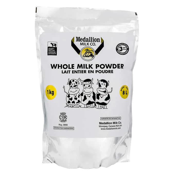 Medallion Milk Co. Whole Milk Powder is a high quality powdered milk that makes 8L of 3.25% mf milk. It is a product of Canada and comes in a 1kg container size. Enjoy the delicious taste of Medallion Milk Co. Whole Milk Powder today!