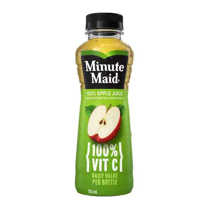 Satisfy your thirst with Minute Maid Apple Juice! Each bottle contains 100% pure apple juice made from concentrate with no added sugars and vitamin C added for a refreshing and delicious drink. Enjoy this wholesome juice with no preservatives and 170 calories per bottle. Get a pack of 12 × 355 mL bottles today and enjoy the goodness of Minute Maid!