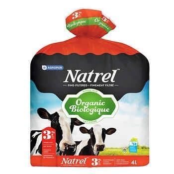 Natrel Organic Homogenized 3.25% Milk is an excellent source of calcium and vitamin D with 100% Canadian milk. It is certified organic, pasteurized, and homogenized and comes in a 4 L jug with 3 × 1.33 L bags inside. Keep refrigerated.