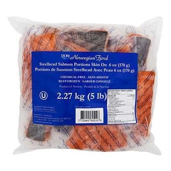 Experience the incredible taste and texture of Norwegian Fjord Frozen Skin-on Steelhead Salmon. Our individually quick-frozen, boneless, 170 g (6 oz) portions are individually vacuum packed for freshness and convenience. Our salmon is chemical-free, antibiotic-free, and GMO-free, and contains no sodium tripolyphosphate. The 2.27 kg (5 lb) box is perfect for stocking your freezer for dinners and special occasions. Enjoy the exceptional taste of Norwegian Fjord Frozen Skin-on Steelhead Salmon - keep it frozen for maximum freshness.