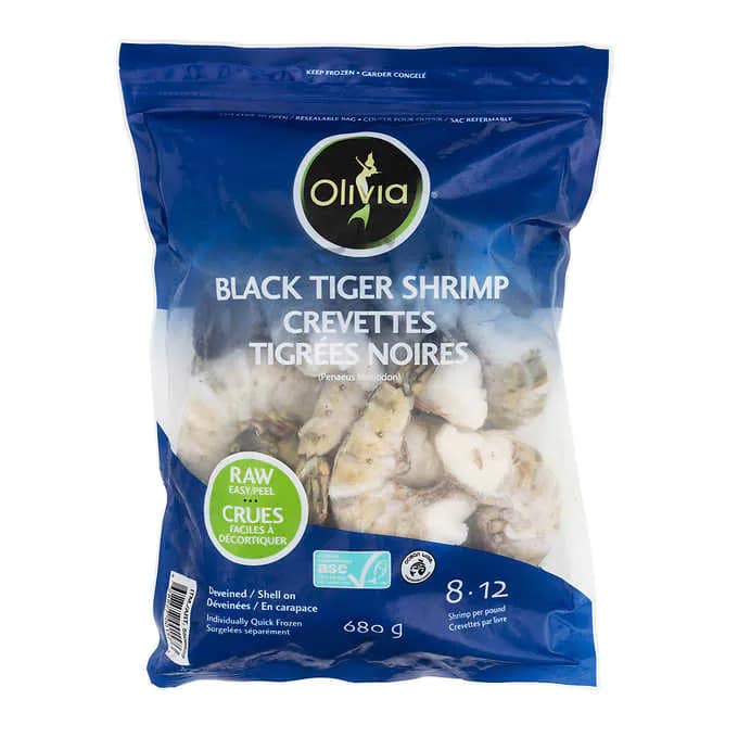 Olivia Frozen Black Tiger Shrimp 8-12 offers raw, individually quick frozen, easy-peel, deveined, and shell-on shrimp that comes in a 680g bag. It has 8-12 shrimp per 454g (1 lb). Keep it frozen for best quality.