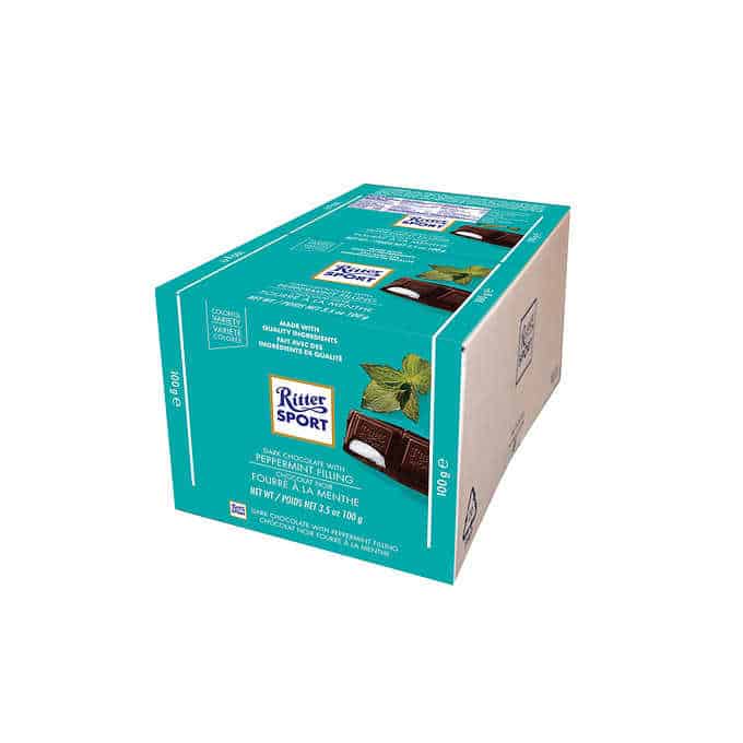 This 12 pack of Ritter Sport Peppermint Chocolate Bars is the perfect treat for any occasion. Each bar weighs 100 g and features a delicious dark chocolate shell with a refreshing peppermint filling. With every bite, you'll experience a burst of minty freshness that will leave you wanting more.