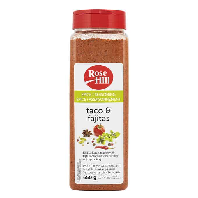 Rose Hill Taco and Fajitas Seasoning is a 650-gram container of granulated seasoning designed to add Mexican flavor to tacos and fajitas. This seasoning is brand new and will add a delicious and unique flavor to your meals.