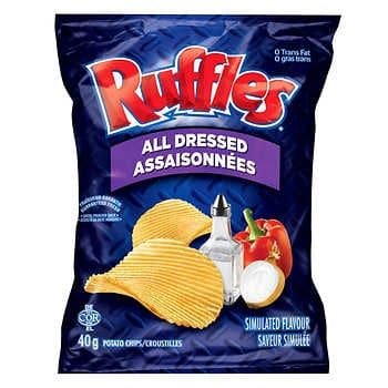 Ruffles All Dressed Chips are the perfect snack for any occasion. With 0 trans fat and 48 × 40 g (1.4 oz) per package, these chips provide a delicious snack without any guilt. Enjoy the perfect combination of tangy, sweet, and savory flavors in every bite!