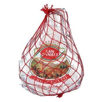 San Daniele Prosciutto is produced according to old-world tradition, slow-cured for months, and unsliced with 0 trans fat and 30% meat protein. This deli meat is individually wrapped and should be kept refrigerated. The average weight is 5.2kg.