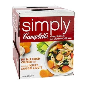 Campbell's Simply No Salt Added Chicken Broth is the perfect addition to your pantry. With no added salt, artificial colours or flavours, and fat-free, this ready-to-use broth is a great way to add flavour to any dish. Each package contains 6 containers of 946 mL of broth. Enjoy the delicious taste and convenience of Campbell's Simply No Salt Added Chicken Broth.