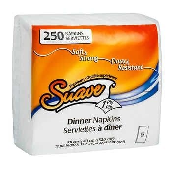 Make sure your tables, buffets, and dining tables are always set with our premium Suave 1-ply Dinner Napkins. These napkins are made with the highest-quality virgin paper, making them both strong and soft. Coming in a white color, they have a napkin dimension of 38.1 cm × 40.64 cm (15 in × 16 in) and are sold in packs of 250 with a total of 3,000 napkins. Don't be caught without these must-have napkins at your next gathering!