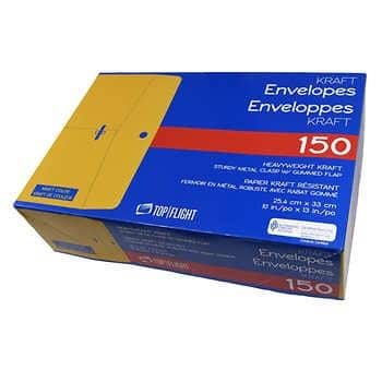 Organize your mail with Top Flight Kraft Envelopes! Each envelope is made of heavy-duty kraft paper and features a sturdy metal clasp with a gummed flap. The envelopes measure 25.4 cm x 33 cm (10 in x 13 in) and come in a pack of 150. Whether you're sending important documents or cards, you can trust these envelopes to get the job done!