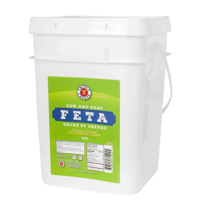 Triple A Cheese Cow & Goat Feta is the perfect choice for your deli or soft cheese needs. With 22% M.F., 55% moisture, and traditional feta in brine, this 12 kg feta will keep your deli stocked with deliciousness. Keep refrigerated for the best quality.