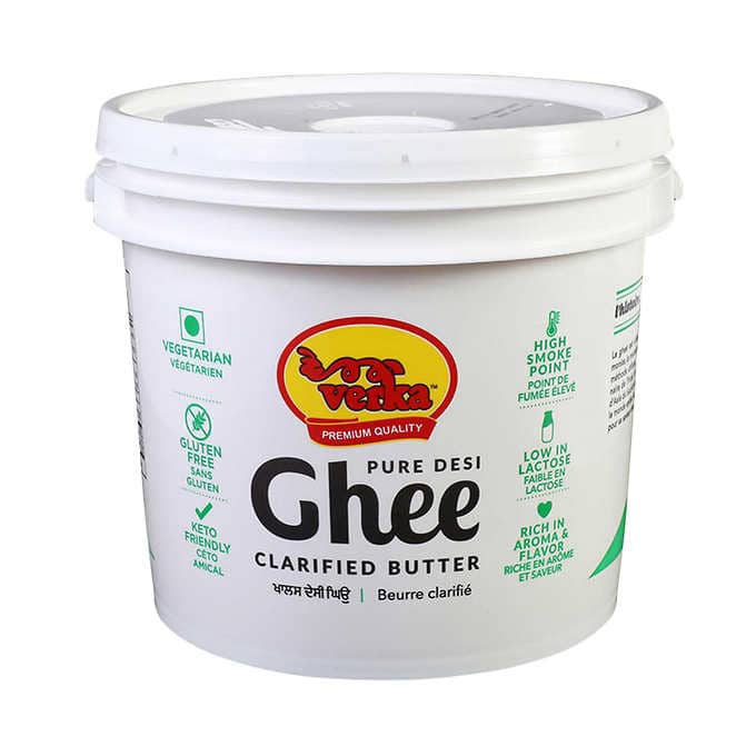 Verka Pure Desi Ghee is a clarified butter with a rich aroma and flavour. It has a high smoke point, is low in lactose, vegetarian, gluten free, and keto friendly. This item comes in a 3 kg container.