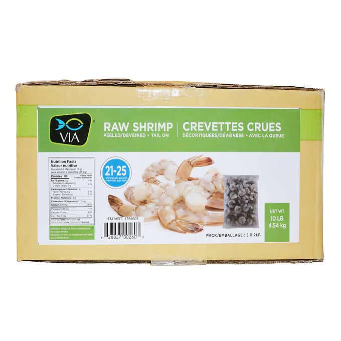 VIA Raw Shrimp is a delicious and convenient frozen food option. Each 2 lb bag of frozen VIA Raw Shrimp contains 21 - 25 shrimp per pound, peeled and deveined with tails on. It is individually quick frozen for freshness, and comes in a 0.9 kg package with 5 bags in a 4.54 kg (10 lb) package. Enjoy the convenience of VIA Raw Shrimp, the perfect addition to any meal. Keep frozen for the best results.