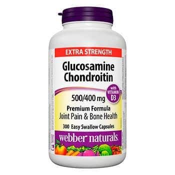 Webber Naturals Extra-Strength Glucosamine Chondroitin Sulfate is an easy to swallow capsule supplement designed to support joint pain and bone health. Each capsule contains 500/400 mg and comes in a bottle of 300 capsules.